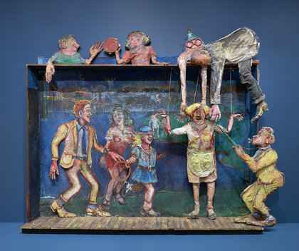 Perpetually rearranging both complete and in-progress works in microcosmic configurations, Leaf created a recurring cast of characters, compositions, and stories that synthesized outside influences with symbols drawn from her own self-mythology. Her figures wobble, jostle, climb, and spin as they engage in a timeless struggle for agency within metaphysical chambers—some evocative of Leaf’s studios, and others of seedy bars, dollhouses, and theater stages.